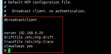 # broadcastclient #注释改行 driftfile /etc/ntp.drift #保持默认 tracefile /etc/ntp.trace #保持默认 server 192.168.6.20 #添加NTP服务器地址